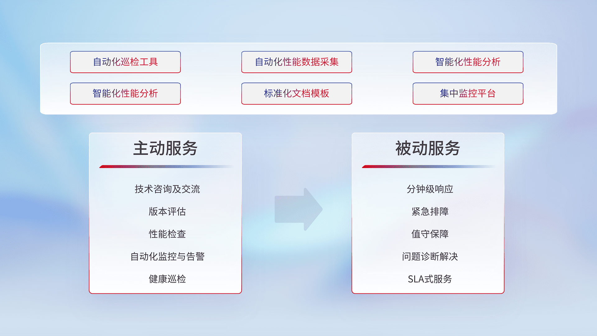 智能化工具和标准化文档,,,保障服务质量,,,,提供主动服务(包含技术咨询、、、、版本评估、、、性能检查、、、自动化监控与告警、、、健康巡检)和被动服务包含(分钟级响应、、、、紧急排障、、值守保障、、、、问题诊断解决、、、、SLA服务)。。。。