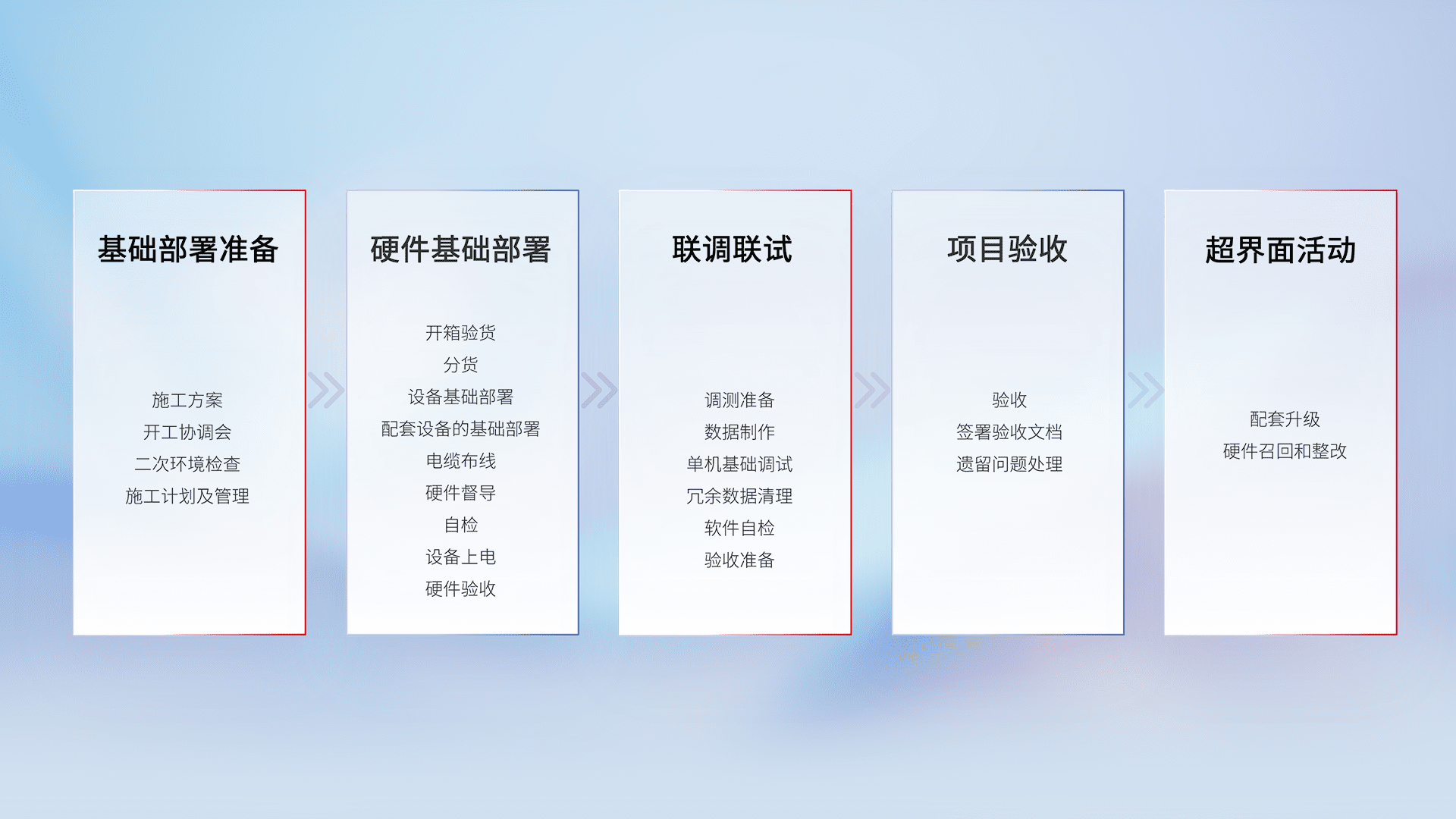 从基础部署准备、、硬件基础部署、、联调联试、、项目验收、、、、越界面活动的全过程可追溯,,,,保证施工质量和进度。。。
